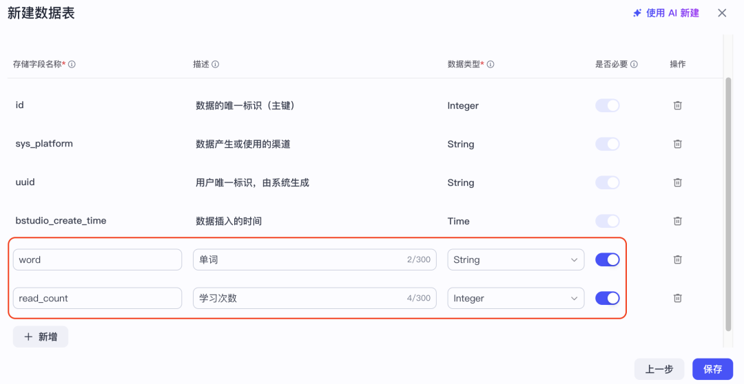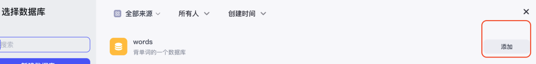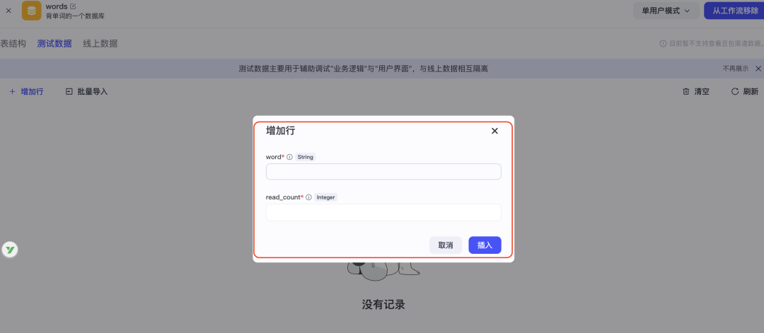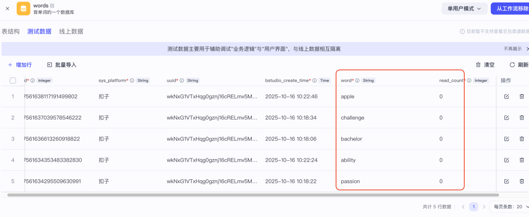 详细看这个图,自己可以添加一些常用的单词即可,不需要多,数据库增加5行即可。(如果需要批量做单词表,可以通过飞书链接读取,我们这个案例只是演示一下跑通整个流程。)