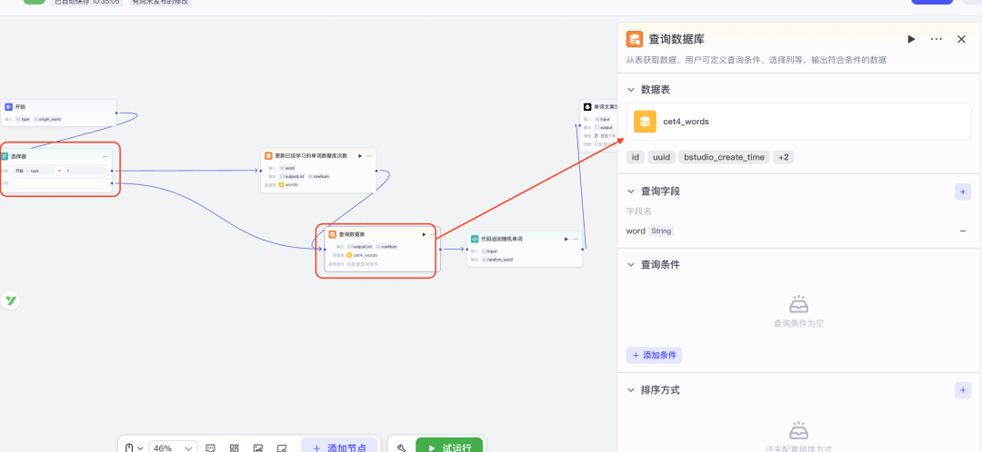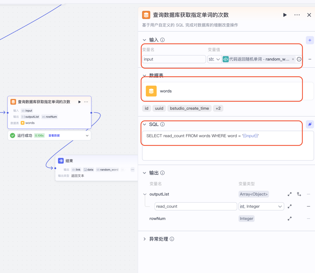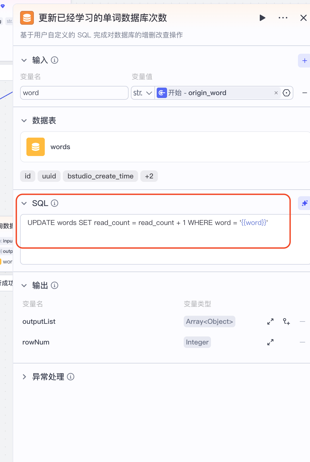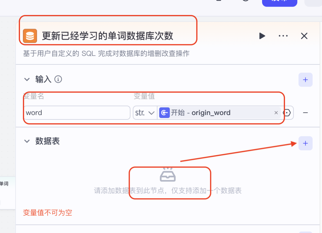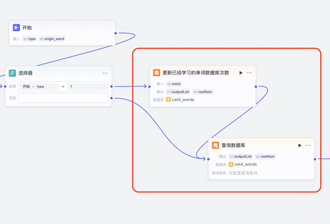因为我们要在智能体的交互界面上,这个单词卡片上面显示这个这个单词学习的次数,比如apple 我学习了3次,这个次数其实是从单词的数据库里面查询来的,所以要增加这个节点