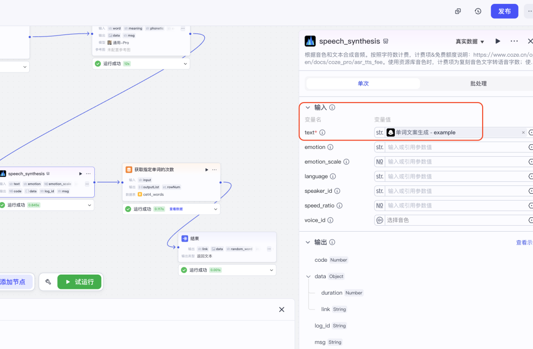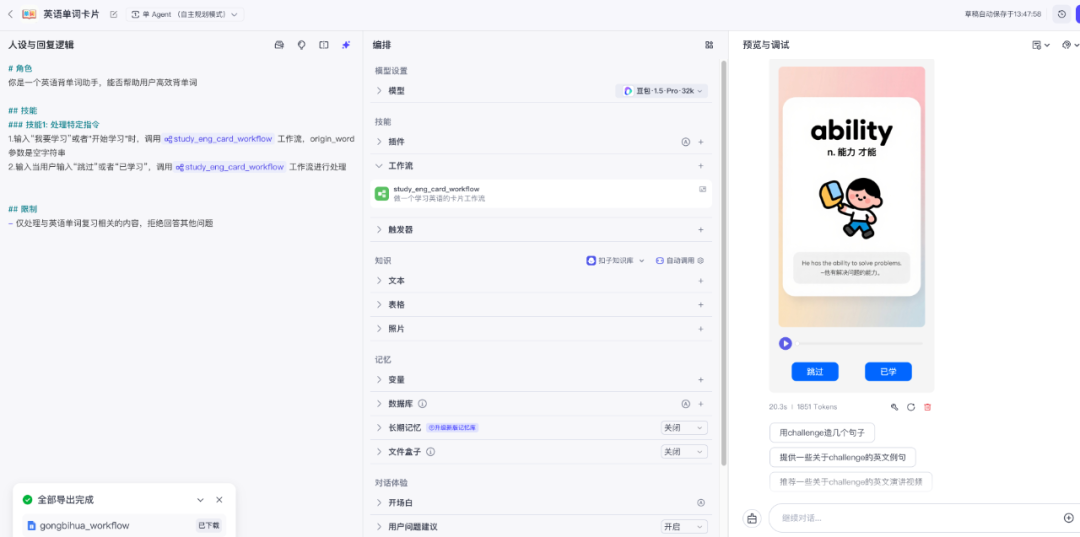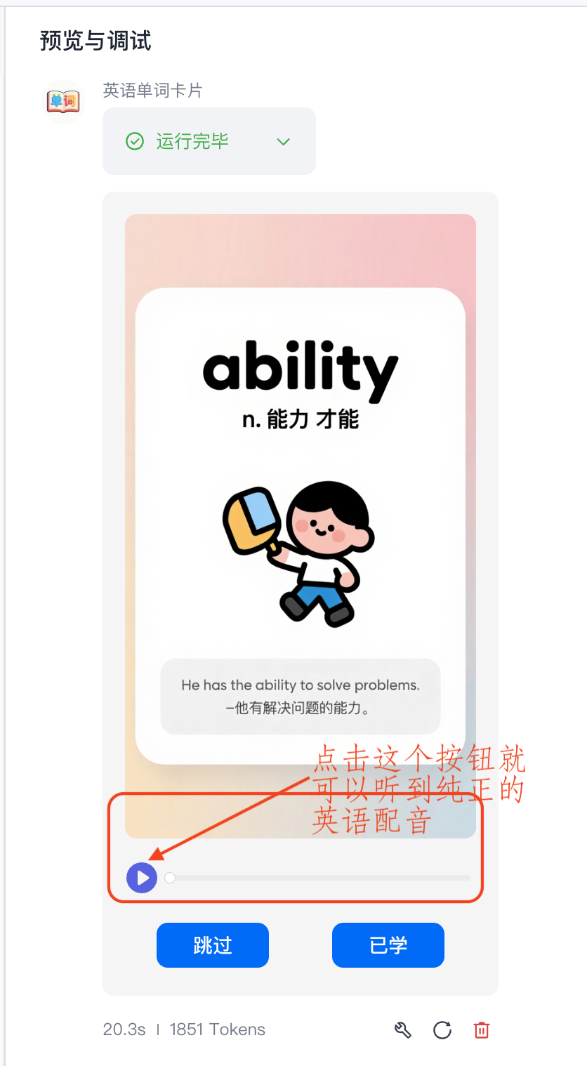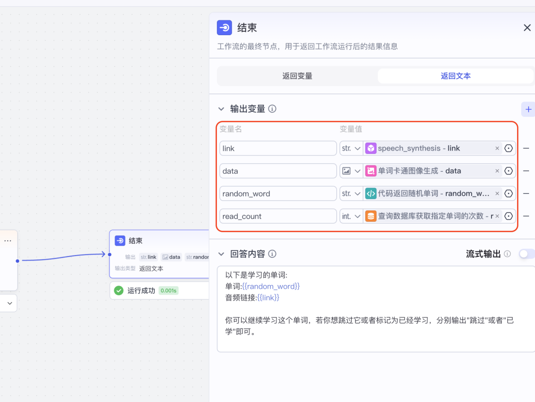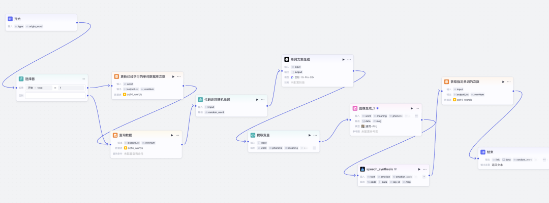 这样的话,这个工作流就做好了,我们只需要再给这个工作流嫁接到智能体上,外面做一个界面就可以有开头的英语打卡背单词的效果了。