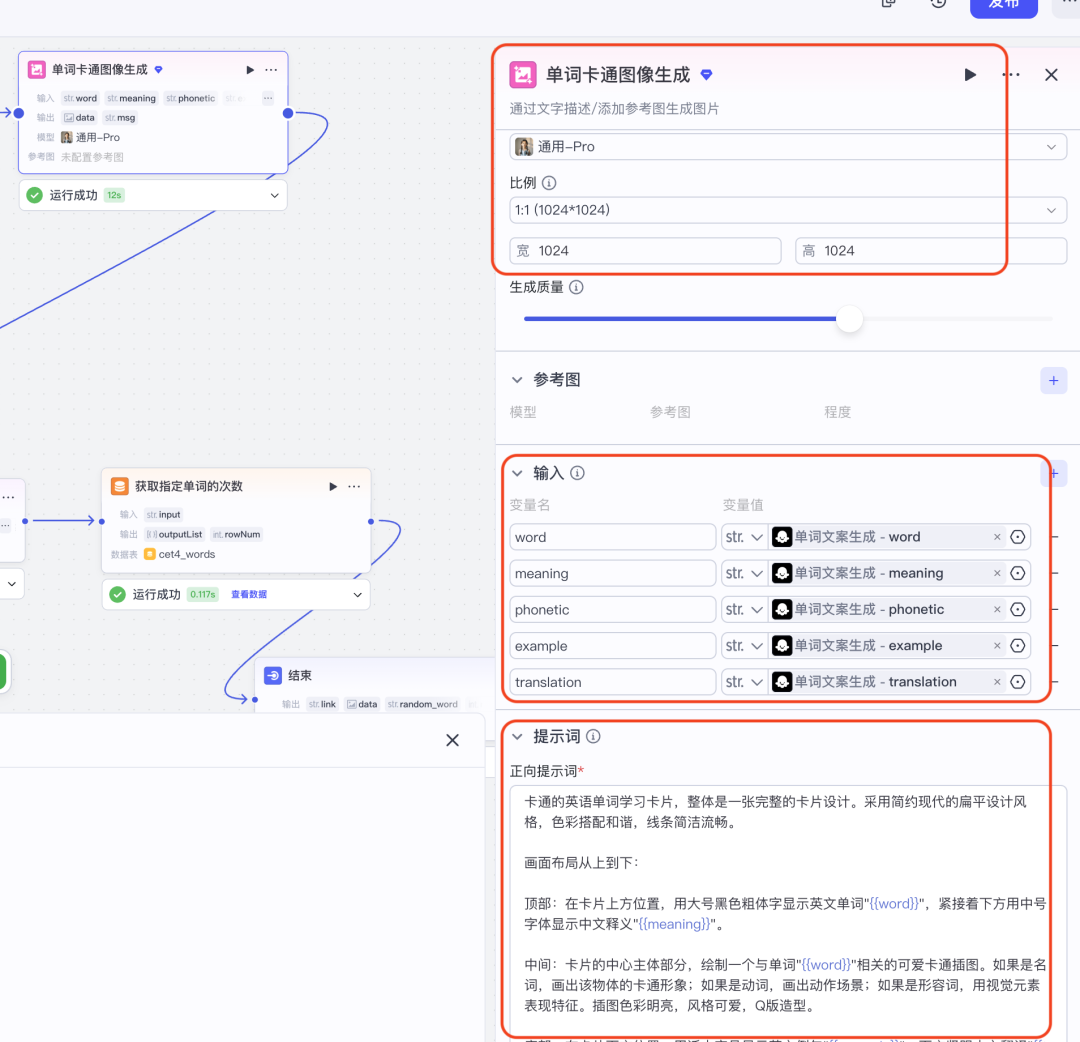 图像模型就用:通用-pro,然后输入的变量 就是从单词文案生成里面的把每个变量都引用进来。