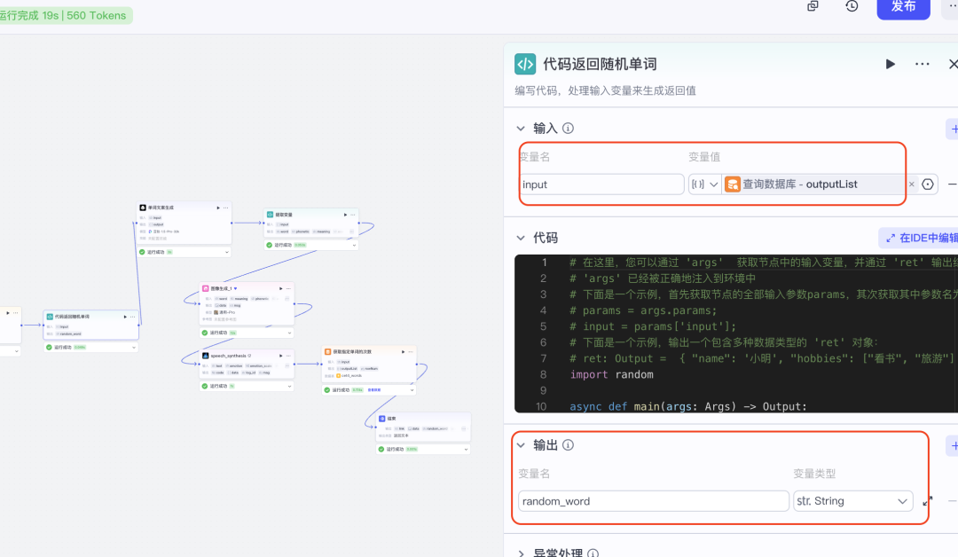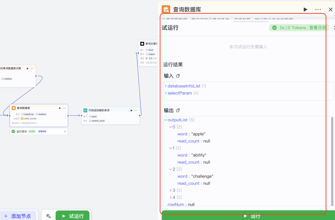 输入就是我们前面查询数据库节点输出的单词列表,然后我们这个节点的输出就是一个随机的单词