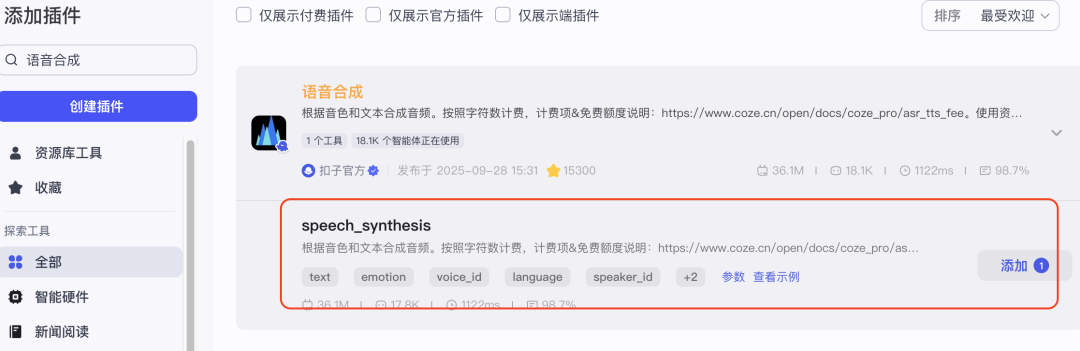 怎么做呢,其实也不难,我们插入一个配音节点,在插件市场找到这个插件 扣子官方的语音合成这个插件,然后把它里面的speech_synthesis 添加进来即可