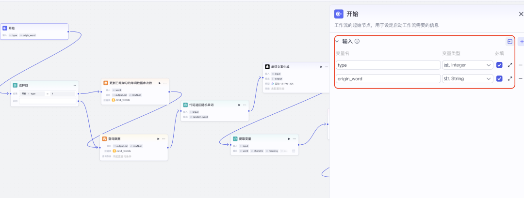 开始节点有2个变量 ,一个是type ,一个是origin_word ,就是如果type 0 表示跳过,如果type 1 表示已经学习,然后origin_word 就是我们已经学习的单词。
