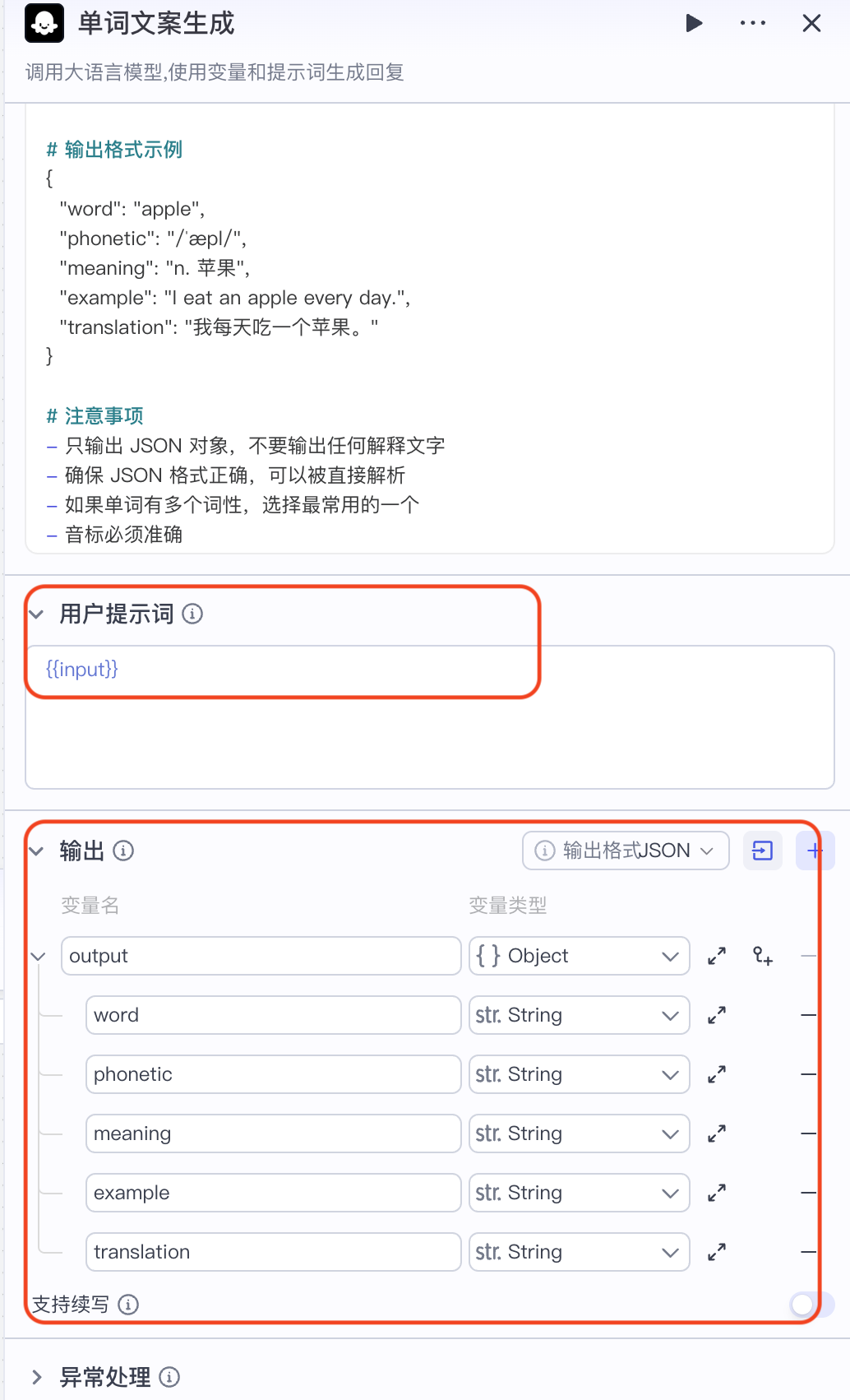 这里就涉及到一点点编程知识了,如果以前是玩过数据库的同学就会比较好理解,我们的这个工作流,其实需要对单词进行数据库管理。所以我们需要设计2个变量: