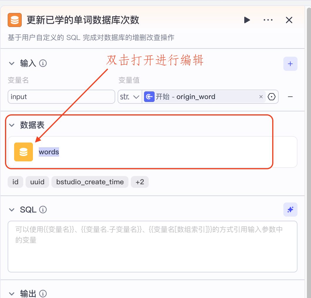 打开这个数据库节点之后,我们需要把这个节点的名字改一下,然后输入引入的变量是word ,主要是用开始节点的origin_word.(因为我们其实就是对这个word进行数据库查询的)