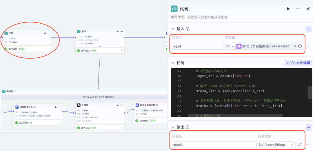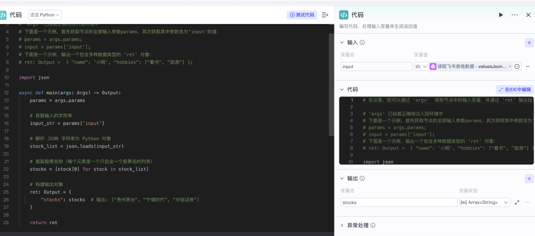 比如我们这个案例节点已经读到了数据,但是这个数据是一个json格式的,里面其实我们我们只需要"valuesJsonString": "[[\"酒鬼酒\"],[\"宁德时代\"],[\"中信证券\"]]" ,其他的都不需要,怎么处理呢? 其实很简单,用代码节点写一段代码来处理