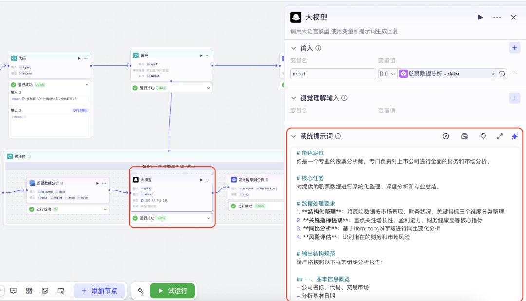 然后我们需要对获取的股票信息,财务数据 进行summary ,这个就需要用大模型来帮我们总结。这个是大模型节点的配置: