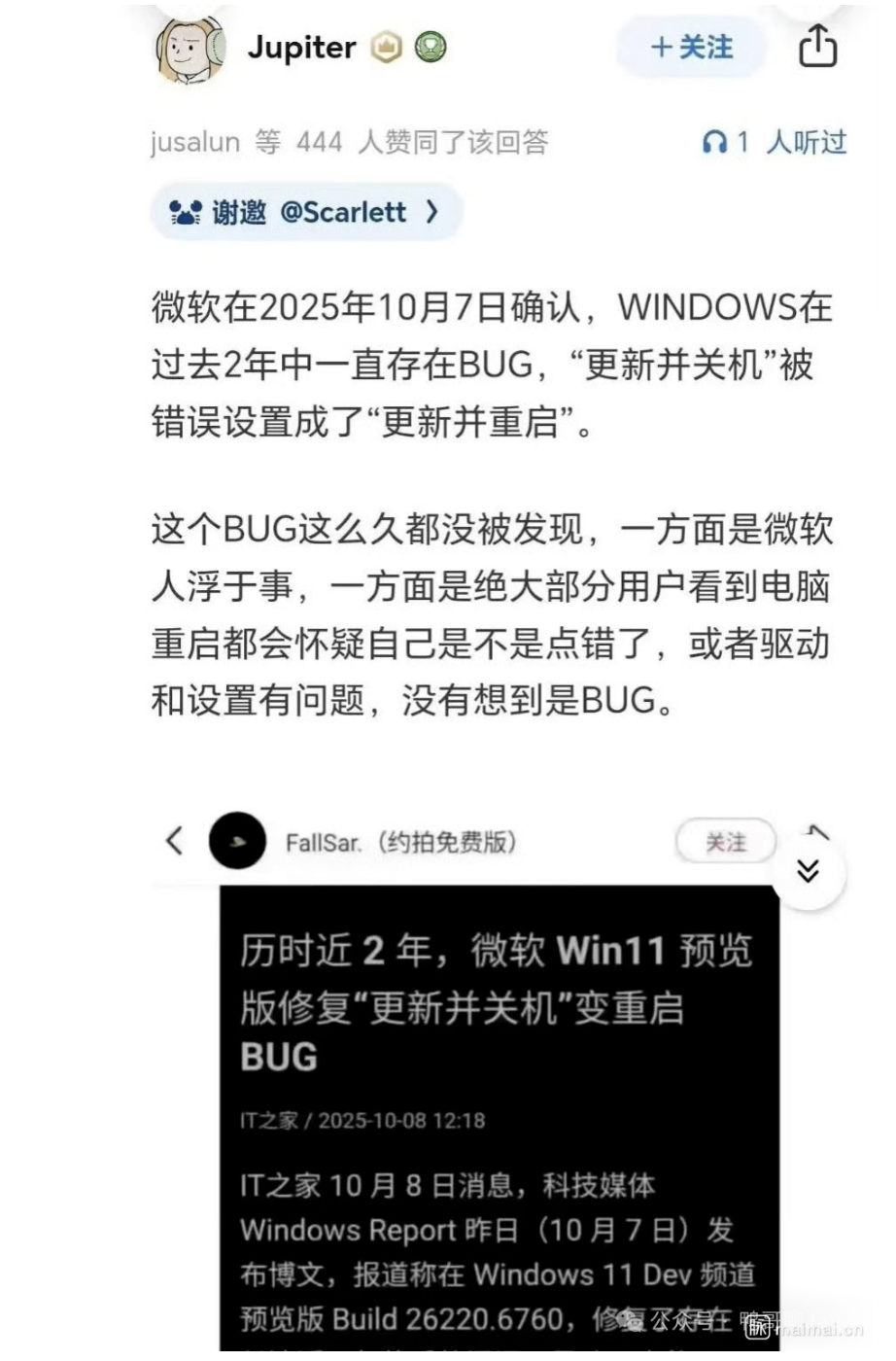 微软官方确认,Windows系统这两年里存在一个bug——当你点击"更新并关机"时,电脑实际上会"更新并重启"。也就是说,你以为自己在优雅地结束工作,结果电脑背着你又偷偷开了机。