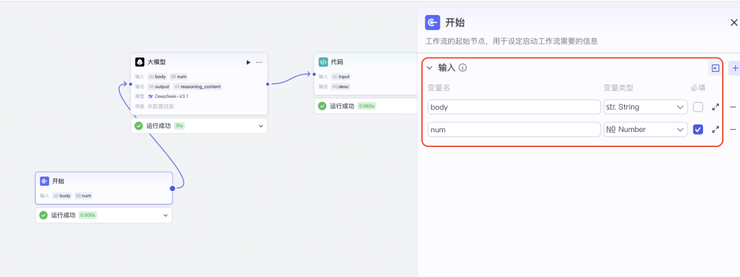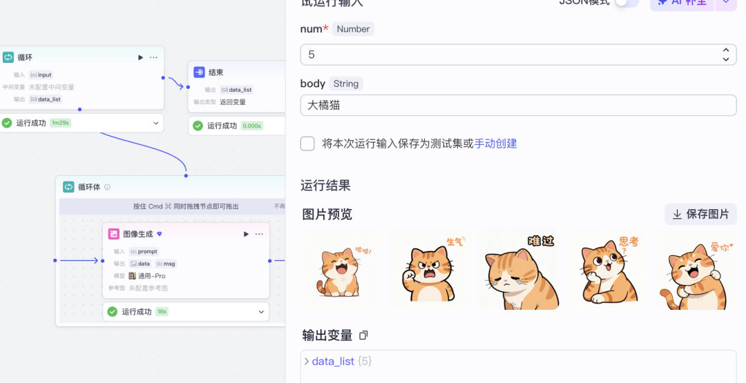 开始节点我们的设计是这样的,这个工作流的目的是能根据用户的需求 指定输出表情包的数量和主题,比如 3张小兔子的,5张大橘猫。