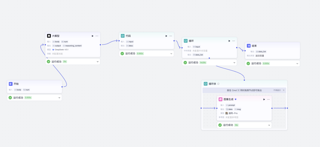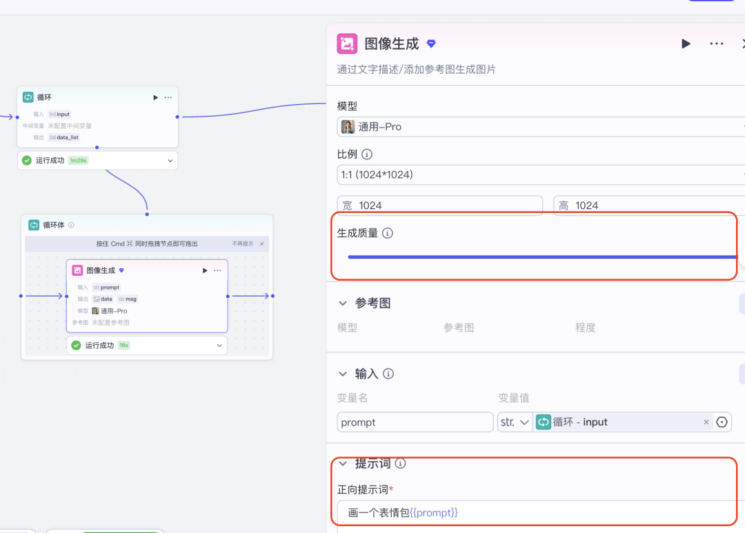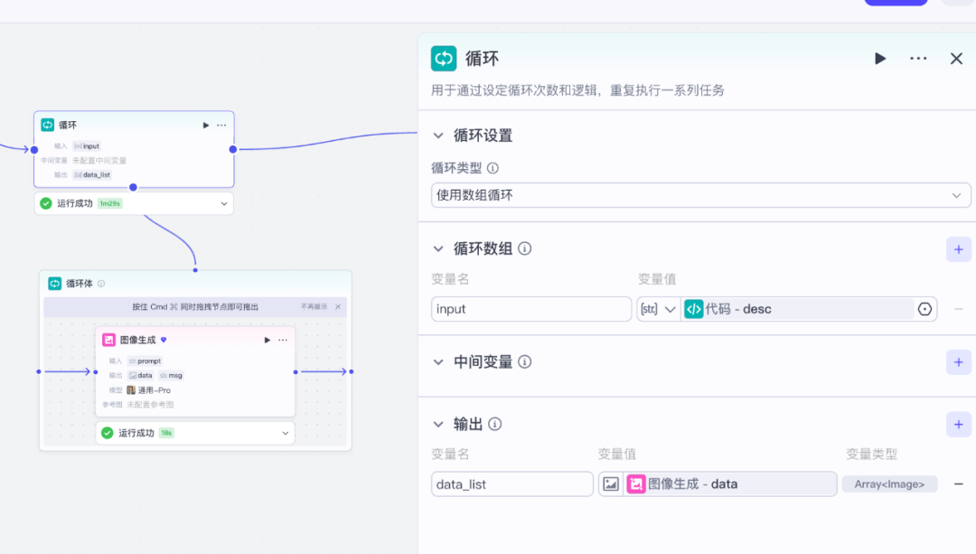 循环节点要做的就是把数组里面的字符串内容,进行循环遍历,然后绘制出来即可。我们喂给循环节点的输入就是前面的input ,其实就是一个数组,里面每一个item都是绘图的大模型的提示词。