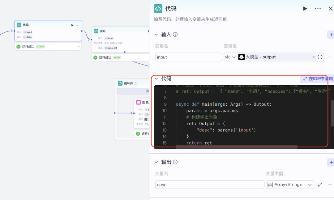 代码节点需要做的事情就是把这个大模型的output的内容转成数组即可,就是这么简单,可以看一下代码节点配置: