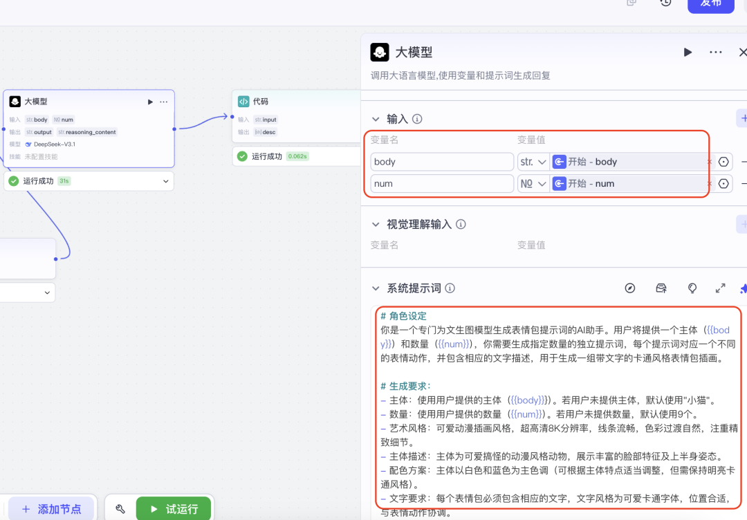 大模型节点主要是通过系统提示词,来输出表情包的数量和表情包绘图的提示词字符串 ,提示词是非常关键的,我们先来看一下整体的节点的设计: