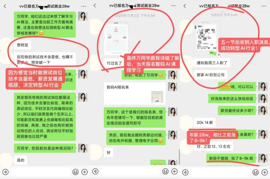 万同学一直做测试,考虑到测试岗位技术含量低可替代性强,薪资也相对较低,因此考虑转型AI行业。在听完课程介绍后,万同学当天报名上车,学习几个月后顺利加入了AI初创公司。最终直接涨薪9k,拿下了年包近30w的offer!