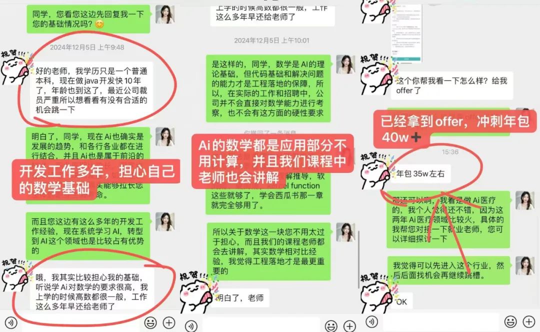 陈同学是有近10年经验的软件开发,近期业务不稳裁员频发,所以考虑跳槽。了解到近期AI方向的岗位年包比较高,很心动,但又觉得自己的基础一般,担心学不好。纠结很久最终还是选择了报名,经过3个月左右的学习,最终拿到了年包40w+的offer!