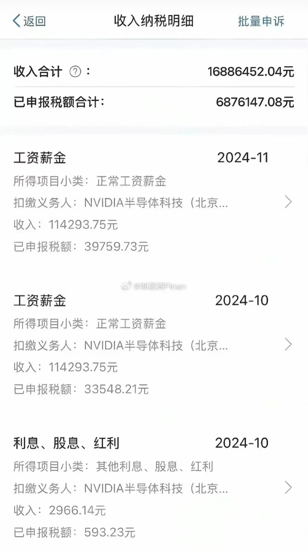 一位英伟达北京分公司员工晒出了工资条,总薪酬1688万,个税687万,月薪11.43万,基础年薪100万,剩下全是股票分红…