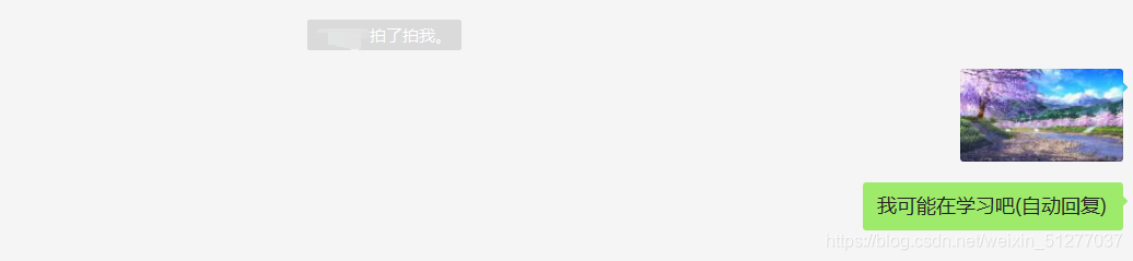 defmy_parser(data):if data["type"] == 5: # 判断是微信消息数据for msg in data["data"]:if (msg["self"] == 0):# 遍历微信消息if msg["msg_type"] == 10000: # 判断是微信拍一拍系统提示 m = re.search('.*?拍了拍我。', msg["content"])if m: # 判断为拍一拍 image_path = f"E:/images/{random.randint(1,4)}.jpg"# 随机选一张回复用的图片 itchat.send_file(msg["wxid1"], image_path) itchat.send_text(msg["wxid1"], "我可能在学习吧(自动回复)")