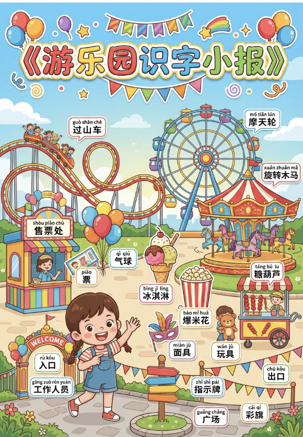 请生成一张儿童识字小报《游乐园》,竖版 A4,学习小报版式,适合 5–9 岁孩子 认字与看图识物。 一、小报标题区(顶部) 顶部居中大标题:《游乐园识字小报》 风格:十字小报 / 儿童学习报感 文本要求:大字、醒目、卡通手写体、彩色描边 装饰:周围添加与 游乐园 相关的贴纸风装饰,颜色鲜艳 二、小报主体(中间主画面) 画面中心是一幅 卡通插画风的「游乐园」场景: 整体气氛:明亮、温暖、积极 构图:物体边界清晰,方便对应文字,不要过于拥挤。 场景分区与核心内容 核心区域 A(主要对象):表现 游乐园 的核心活动(孩子们在玩游乐设施)。可爱卡通人物(身份:游乐园工作人员/游客小朋友皆可)。