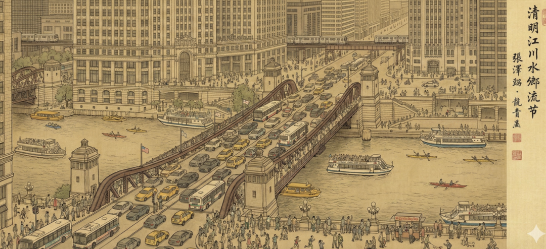 中心场景:俯瞰熙熙攘攘的现代芝加哥河滨。画面焦点是巨大的钢制开启桥(杜萨布尔桥/密歇根大道桥),桥上车水马龙,无数汽车、黄色出租车和芝加哥交通管理局(CTA)公交车穿梭其间,所有景象均以精准的传统笔触描绘。