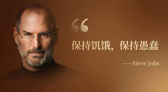 一张宽的名人金句卡,棕色背景,衬线体浅金色 “保持饥饿, 保持愚蠢” 小字“——Steve Jobs”,文字前面带一个大的淡淡的引号,人物头像在左边,文字在右边