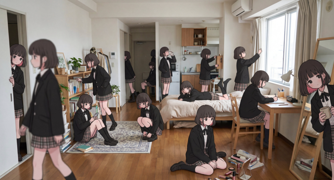 根据上传的参考角色,在一间宽敞的东京女孩公寓内拍摄一个真人场景——一间明亮、充满生活气息的单间,空间比例接近1LDK。房间应包含白色墙壁、温暖的木地板、米色窗帘、一张铺着柔软床品的矮床、一张摆放着化妆品的书桌、书架、绿植、一面立镜、一块地毯、散落的个人物品,以及位于房间后方的紧凑型厨房区域。房间必须具有强烈的景深,前景、中景和深邃的背景层次分明。
