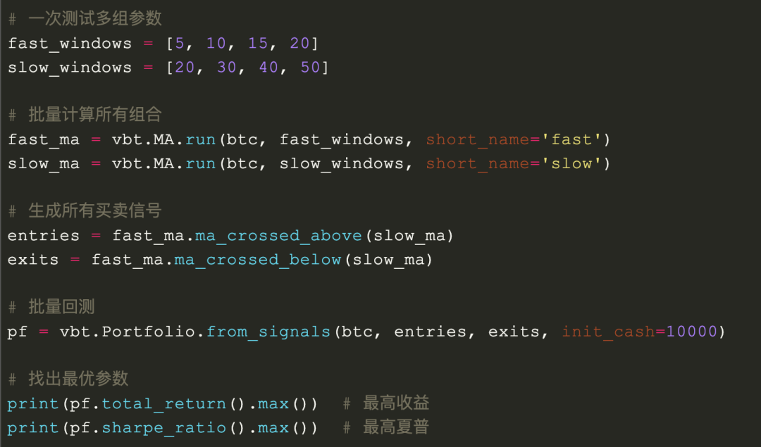 更爽的是参数优化。以前我要测试不同参数组合,得写个双重循环慢慢跑。现在vectorbt直接帮你搞定: