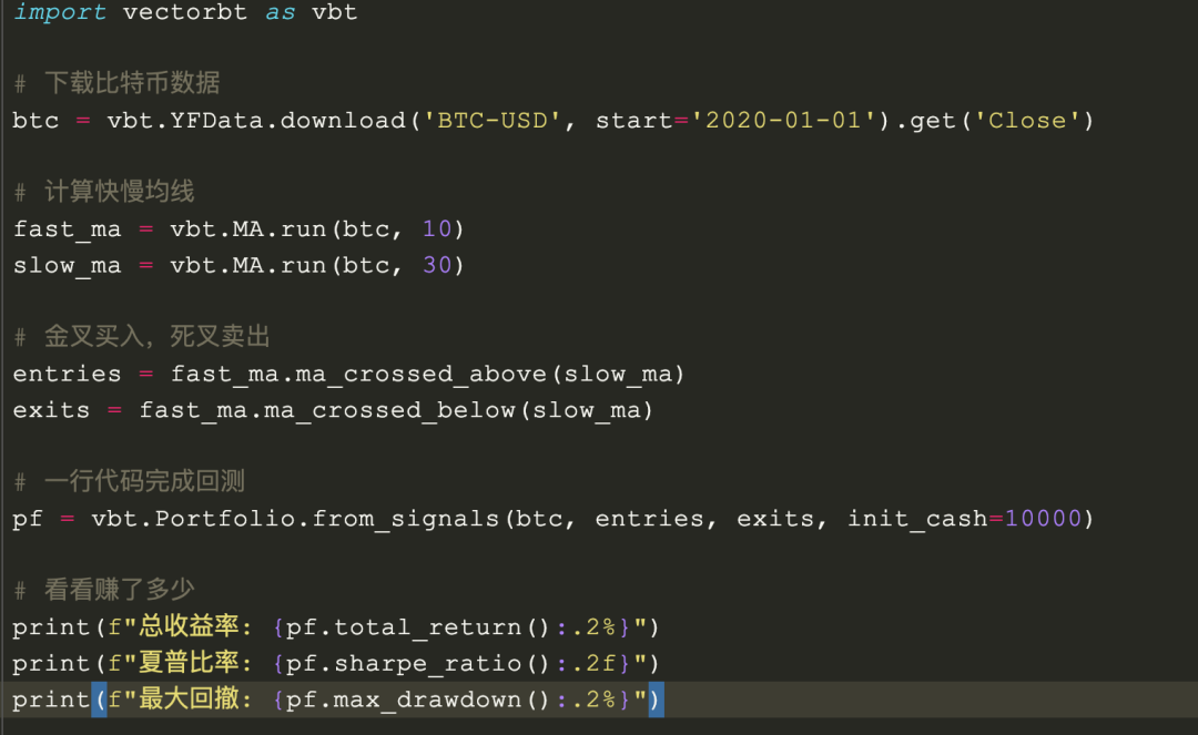 我最喜欢vectorbt的一点是:写起来真的很顺手。来看个最基础的例子,测试一下经典的双均线策略: