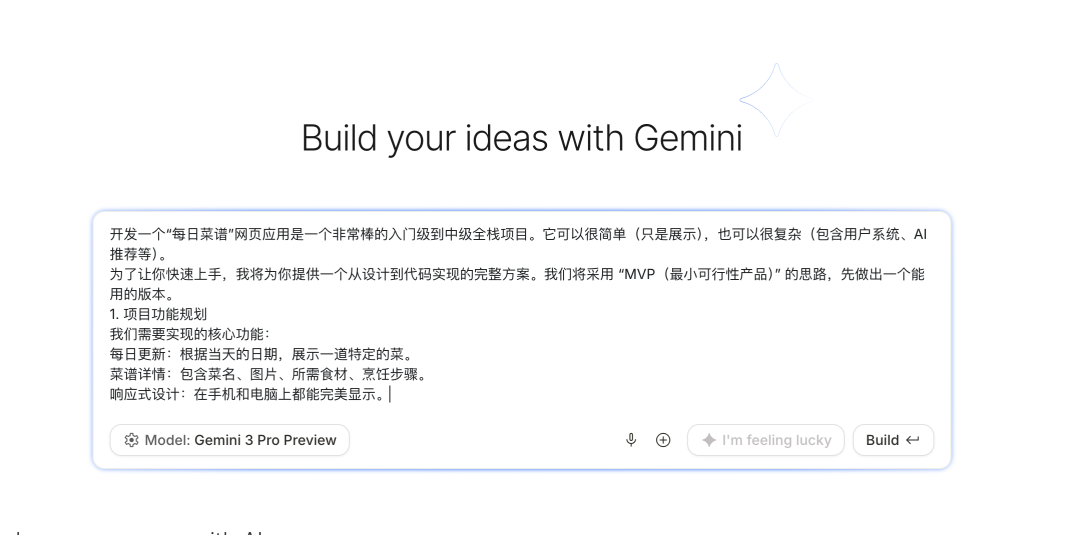 然后输入一段提示词,这个提示词其实可以先通过gemini3 给出了,然后把这个提示词扔给build