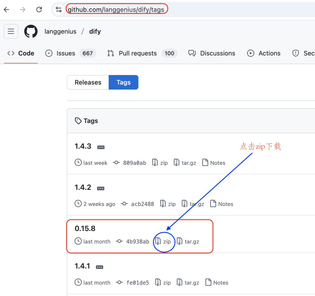 点击zip下载即可,下载到服务器上然后解压即可。 也可以获取这个zip的下载链接 https://github.com/langgenius/dify/archive/refs/tags/0.15.8.zip ,直接用wget 下载,然后解压。
