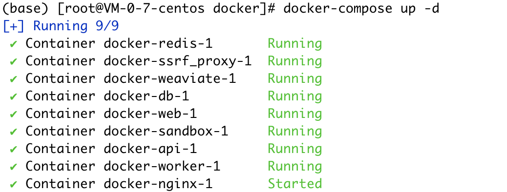 (base) [root@VM-0-7-centos docker]# docker-compose up -d[+] Running 9/9 ✔ Container docker-redis-1 Running 0.0s ✔ Container docker-ssrf_proxy-1 Running 0.0s ✔ Container docker-weaviate-1 Running 0.0s ✔ Container docker-db-1 Running 0.0s ✔ Container docker-web-1 Running 0.0s ✔ Container docker-sandbox-1 Running 0.0s ✔ Container docker-api-1 Running 0.0s ✔ Container docker-worker-1 Running 0.0s ✔ Container docker-nginx-1 Started
