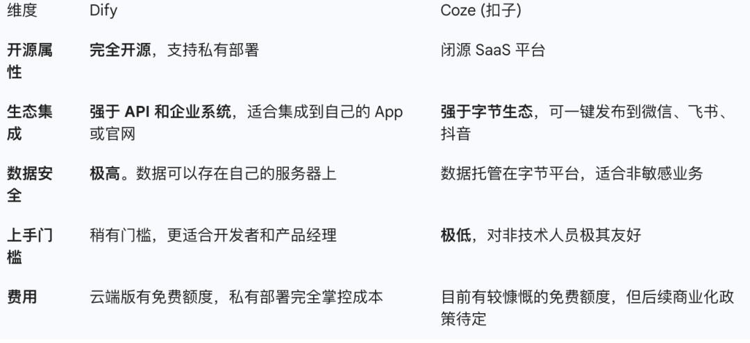 这是大家问得最多的问题。Dify 和字节跳动的 Coze 都是顶级的 AI 开发平台,但它们的“性格”截然不同。