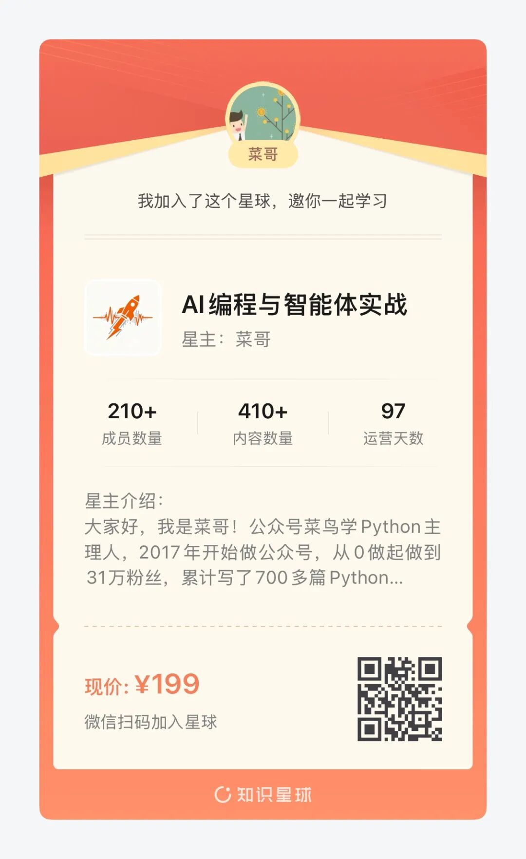 那你可以考虑加入我们的 星球社区,可以学1整年!市场上这样陪跑的价格都是599,799起步,我们只要199,而且我们星球除了AI编程还有智能体教学!非常物超所值!