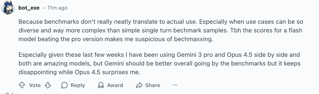 因为基准测试的成绩,并不能很好地对应真实使用场景。尤其是在实际应用中,使用场景往往非常多样,也远比那些单轮对话的基准测试样本复杂得多。坦率地说,看到 Flash 这种定位更轻量的模型在评分上“击败” Pro 版本,反而让我对这种为了刷基准分数的做法产生了怀疑。