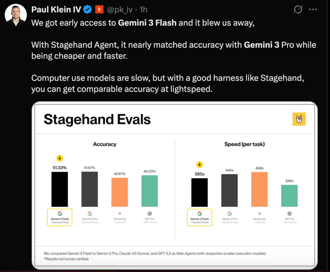 在X上,有些用户使用过Flash 3.0后认为Stagehand Agent 上它的准确度几乎与 Gemini 3 Pro 不相上下,但价格更低,速度更快。