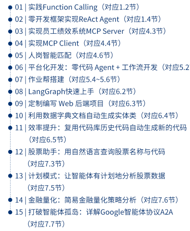 本书配备了共计15讲的配套视频课程,这些课程全程采用带学带练的方式,专门针对书中的核心知识点、项目设计思路以及代码运行效果进行讲解,为读者提供了“AI Agent开发实战”方面的视频内容,读者能够在“异步社区”本书对应的页面进行免费兑换并观看学习。