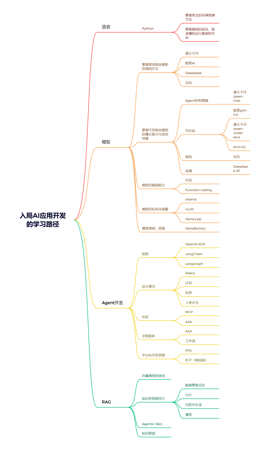 Agent开发是AI应用的核心部分。推荐从ReAct设计模式入手,学会使用OpenAI SDK搭建简单Agent实例。随着技能不断提升,可以通过LangChain、LangGraph等主流框架提升效率。之后,需要熟悉ReAct模式之外的计划模式、反思模式等,并掌握MCP、A2A协议及SDK调用方法。最终,拓展到多智能体系统的开发,以应对更复杂的业务场景。