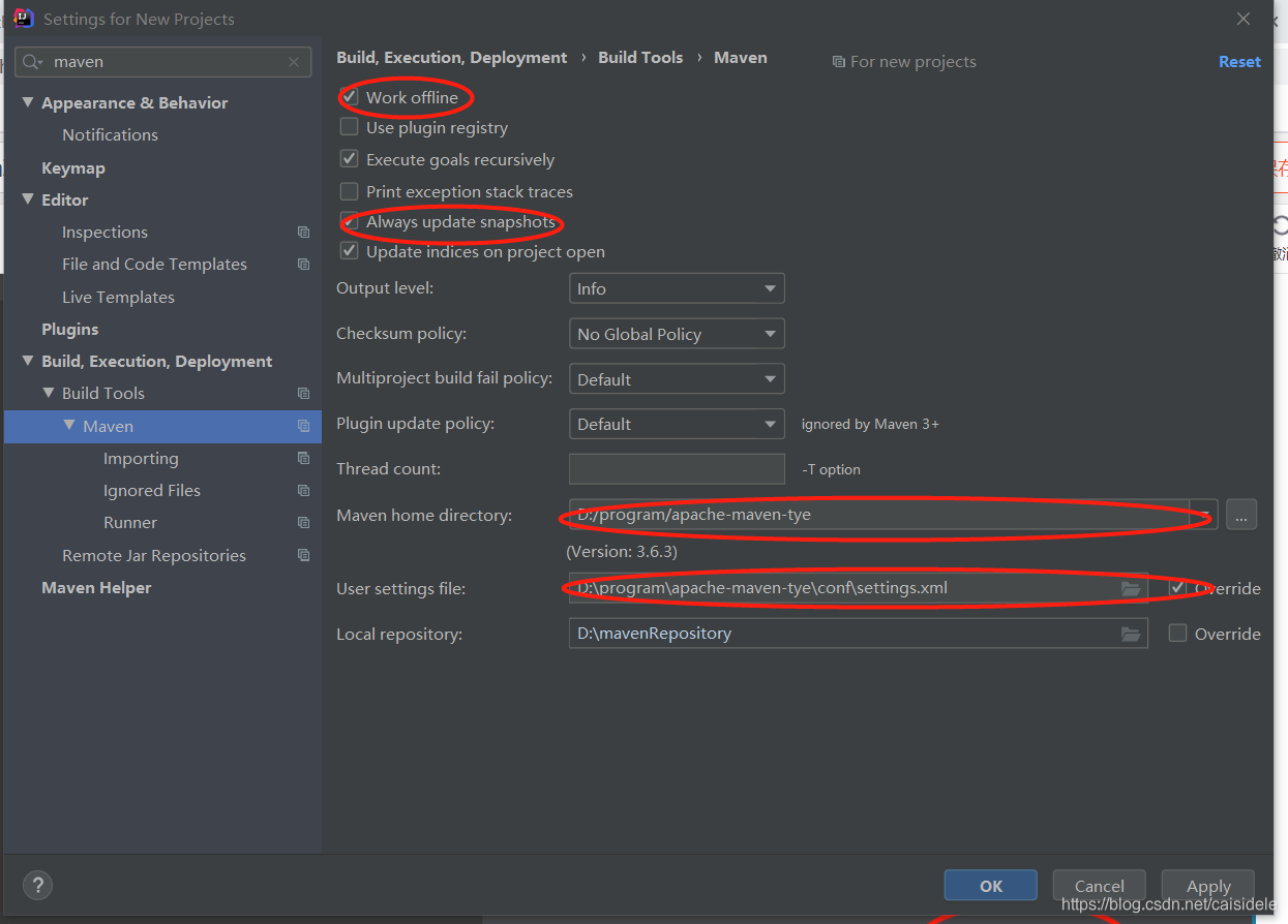 进入的设置页面 setting for new projects(为所有新建项目设置,这样就避免每次创建新项目都要设置,字符,jdk版本都可以在这设置,就不赘述),因为我用的本地仓库所以work offline(离线模式),及时拉取依赖更新(always update snapshots),下面两个就是配置自己的maven,不要用默认的,配置好后会自动带出本地仓库地址