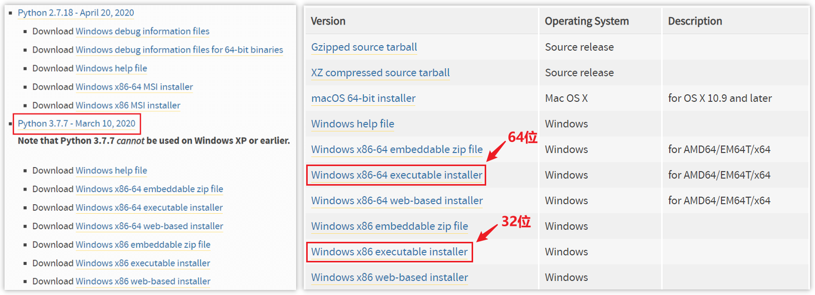 以安装Python 3.7.7为例,进入上面的网址,根据系统 (32/64位)选择,我这里选择下载64位的