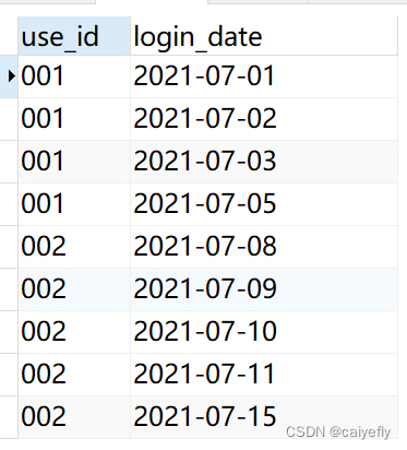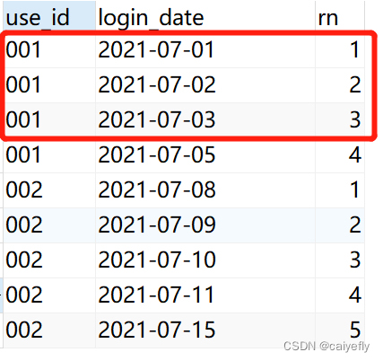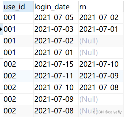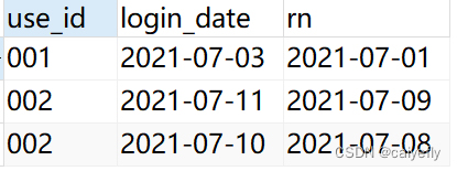 -- 这里需要注意orderby需要降序 -- lead偏移2天,因包含开始偏移日期,所以连续三天只需要偏移2天即可 -- (这里需按实际情况定义“连续”) SELECT use_id, login_date, lead(login_date,2) over(partition by use_id order by login_date desc) rn FROM test
