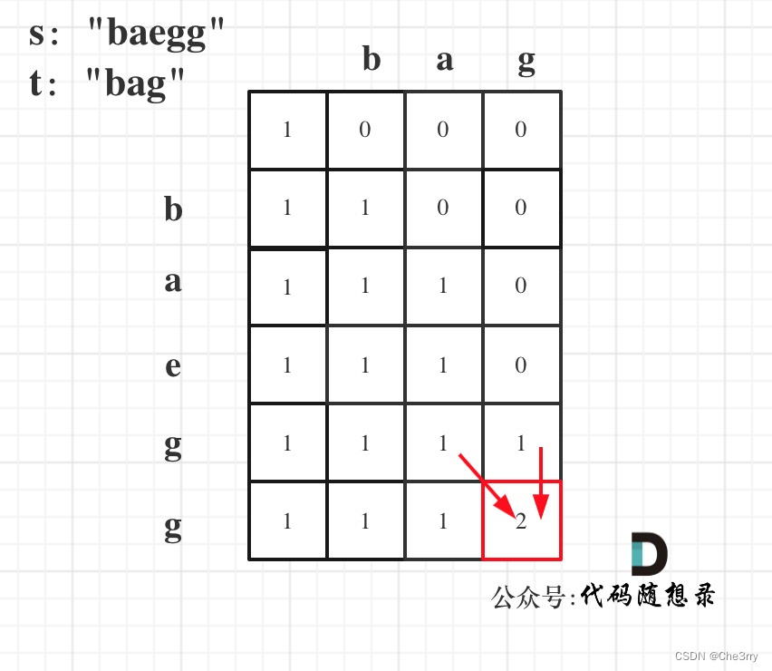 s[i - 1]来匹配t[j - 1],而是保持s的前i - 1个字符匹配t的前j个字符,即s的前i个字符在t的前j个字符中的匹配方式不依赖于s[i - 1],而是与s[i - 2]以及t[j - 1]的匹配方式相关。因此,此时dp[i][j]应该等于dp[i - 1][j]。- 并且要注意的是这里的结果是相加的!相加就是在累积所有方法