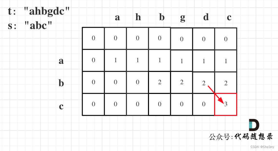以示例一为例,输入:s = “abc”, t = “ahbgdc”,dp状态转移图如下: