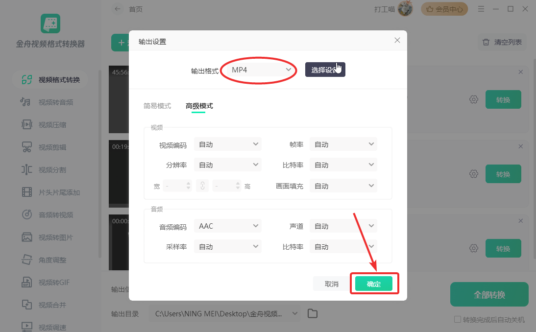第三步:在下方选择【输出信息】,选择输出格式为【MP4】,其他视频编码参数可以根据需要设置,点击确定。