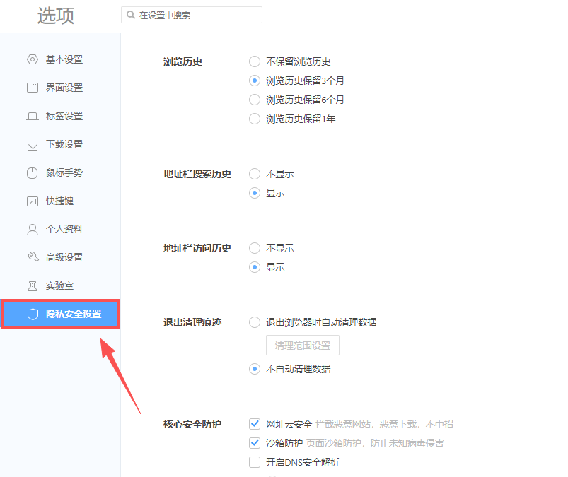 360浏览器:「设置」→「隐私安全设置」→「退出浏览器自动清理数据」。