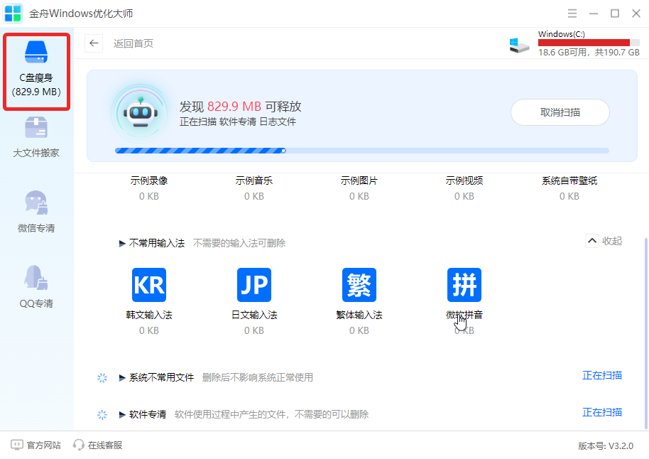 步骤一:电脑下载安装金舟Windows优化大师,选择「C盘瘦身」,因为浏览器缓存默认存储在C盘。
