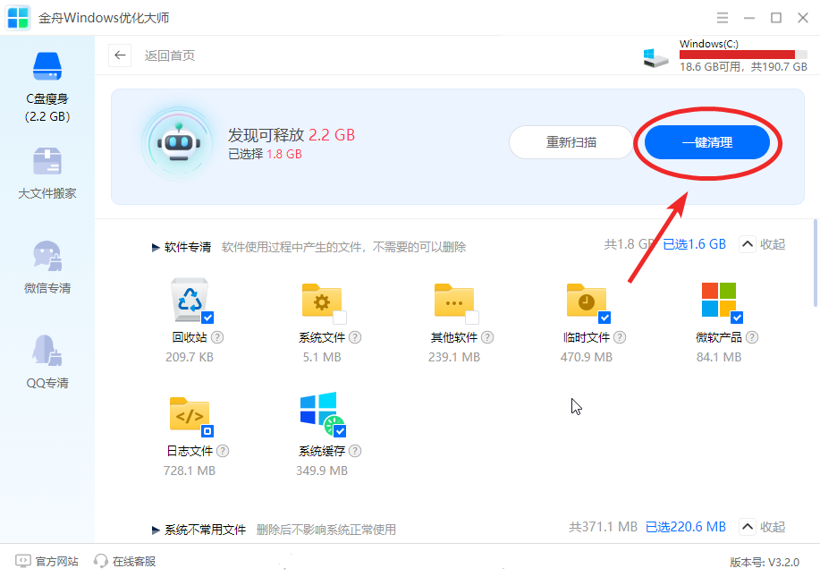 金舟Windows优化大师是一款强大好用的系统优化工具,支持浏览器缓存清理,微信清理、磁盘清理和大文件搬家功能。轻松解决C盘爆红卡顿问题,让电脑运行更流畅!