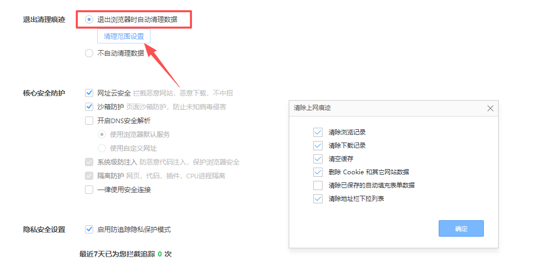 第三步:点击「退出浏览器自动清理数据」,选择清理范围设置,勾选清理类型,点击确定。完成后重启浏览器就可以啦!