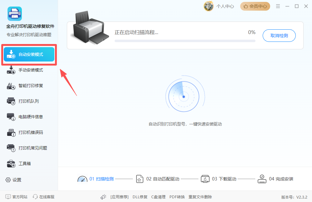 步骤二:双击启动软件,选择“自动安装模式”,软件会自动扫描连接的打印机型号并匹配驱动。
