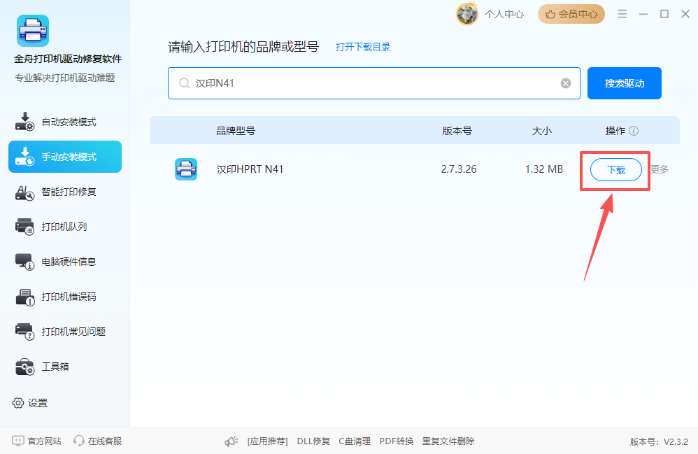 第一步:选择“手动安装模式”,在搜索框输入“汉印N41”,点击“搜索驱动”。
