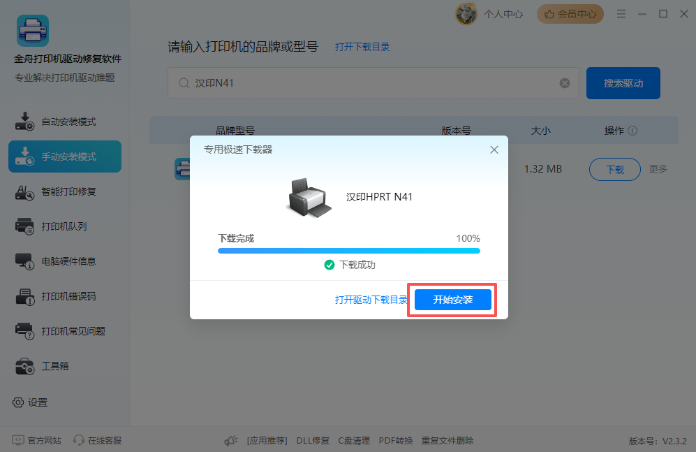第二步:点击下载汉印n41驱动,建议自定义选择安装目录,点击开始下载。