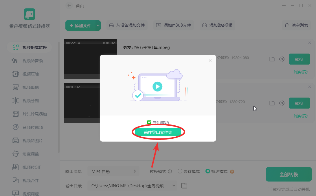步骤4. 开始转换:选择极速模式,点击"全部转换",进度完成后点击"前往导出文件夹"查看文件。