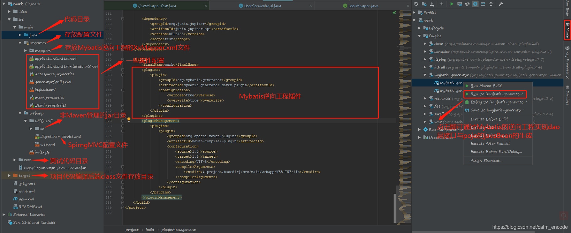 总结:最后通过mybatis的逆向工程插件mybatis-generator就可以根据UserMapper.xml文件的配置信息生成对应的UserMapper接口和名为User的javaBean。
